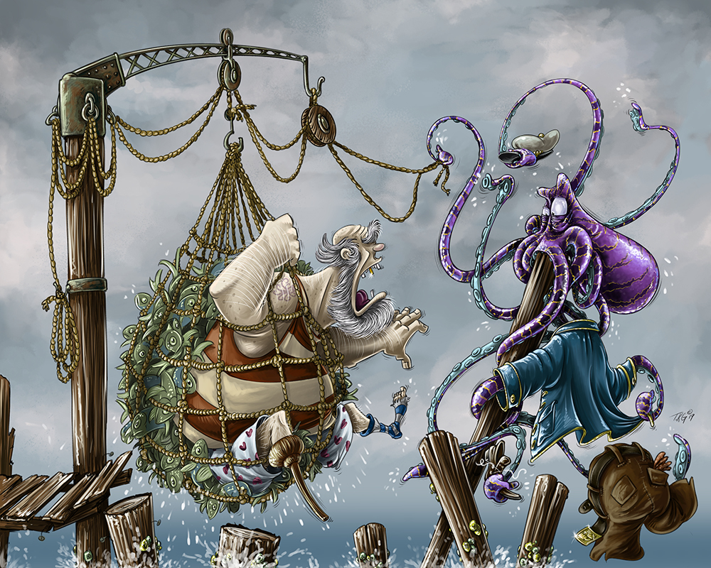 Monty has finally escaped that deranged Captain and his crew. Be sure to look for new monty prints which add to the middle of the story. This 8"x10" (20cmx25cm) heavy stock velvet finish fine art print would make any wall an adventure!