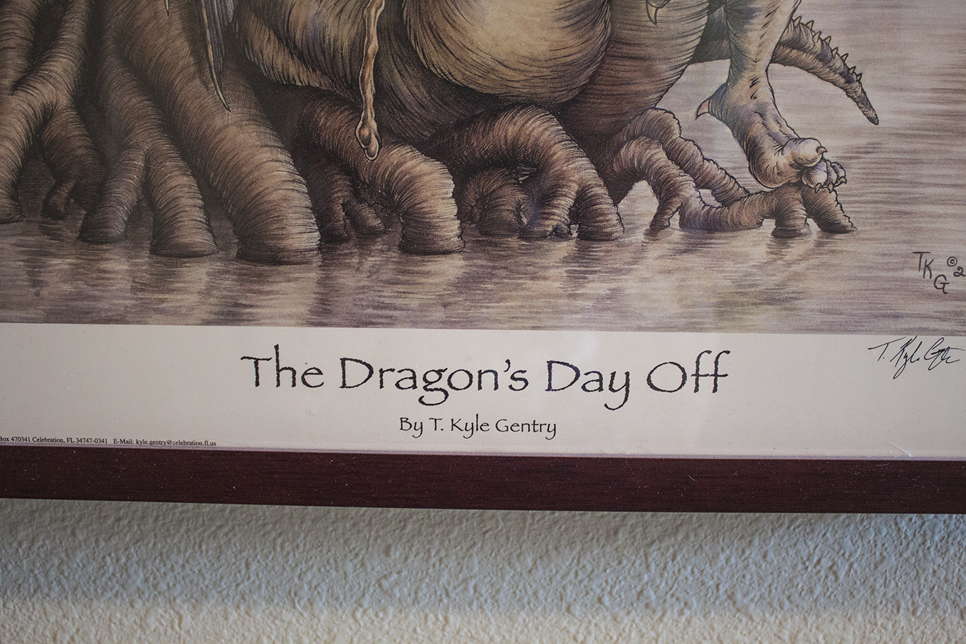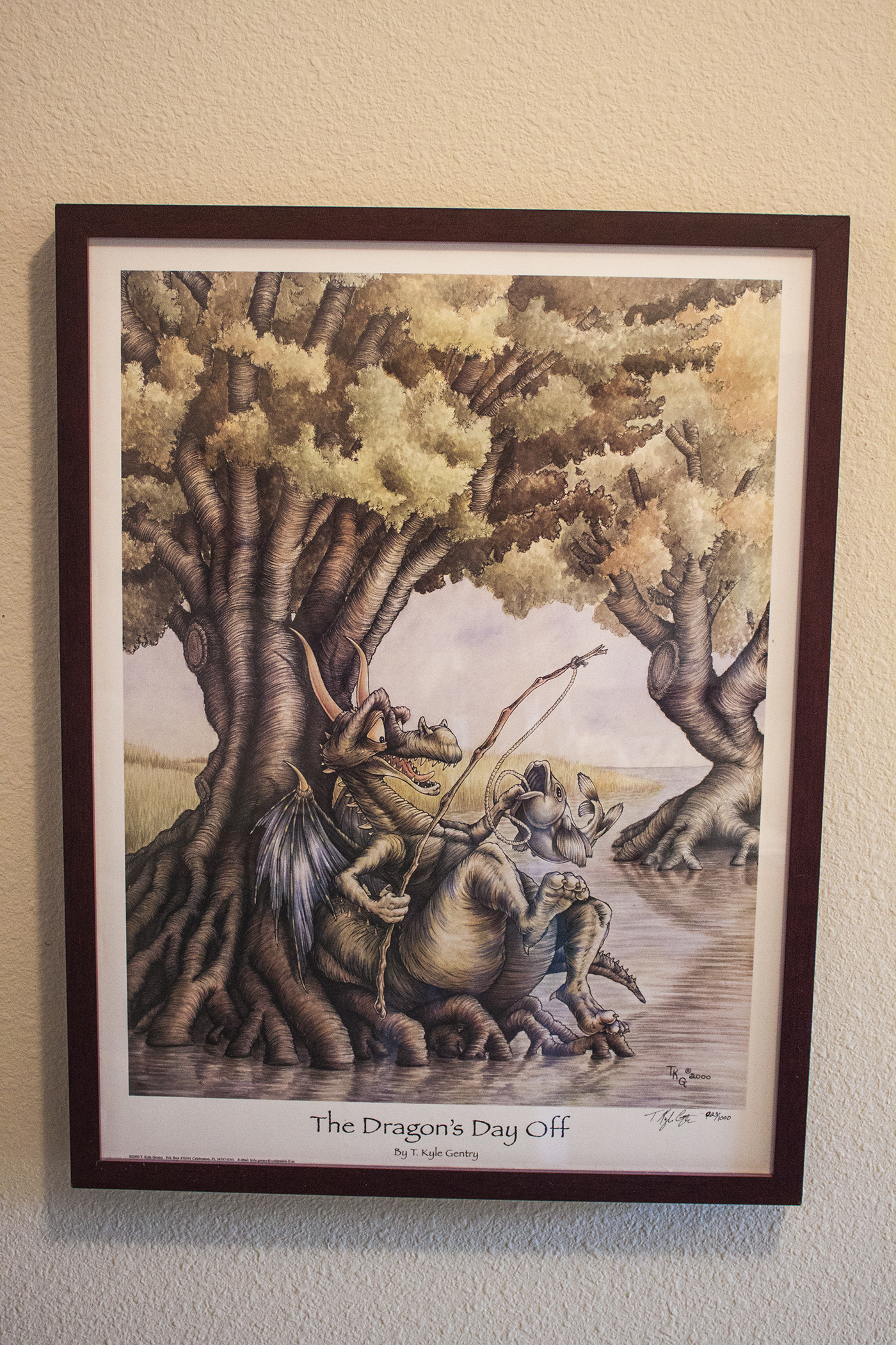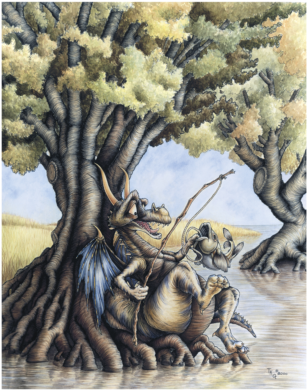 Join this playful dragon as he enjoys a relaxing day of fishing on his day off of battling knights and abducting fair damsels. The illustration on the poster was completed in watercolor and pen and ink. Poster is signed and has a white border with title at the bottom. It is sent unframed. The picture below is for reference. The overall edge to edge measurement is 18x24 which includes the white border in the measurement. Ships to the mainland U.S. via usps unframed and rolled in a mailing tube. No International, Alaskan, or Hawaiian Shipping.